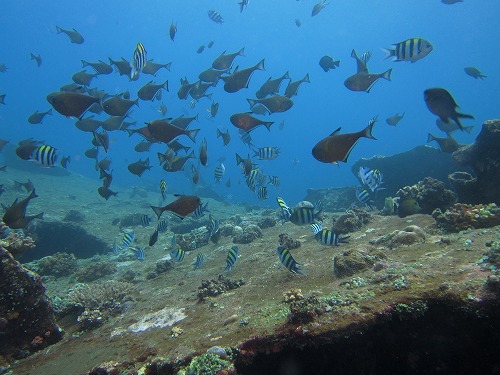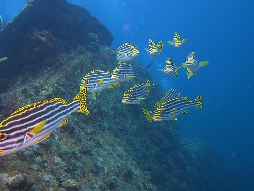 ウミガメ、ナポレオン、ヤッコエイ、バラクーダ、ウミウシ、クマノミ、アオヤガラ、アカククリなどを観察。
