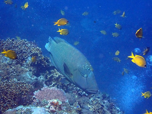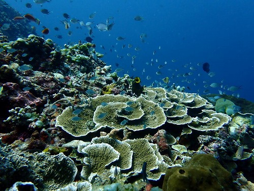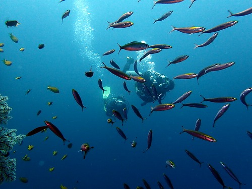 スズメダイ、パープルビューティーのメス群れ、テンス、タカサゴ群れなど。