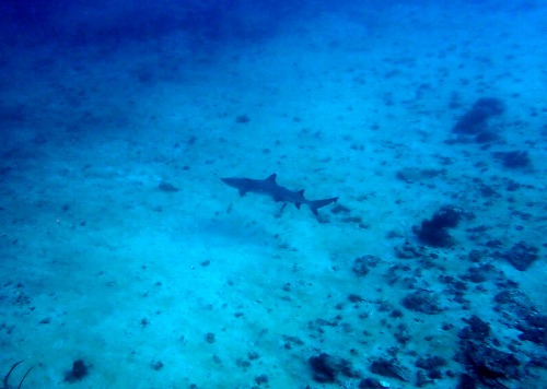 サメが通ってゆき、その後ロウニンアジ!小さなウミガメ、タテジマヤッコのペア、アカヒメジの群れ、コブシメ、アカマツカサの群れ、ムスジコショウダイの群れなど。