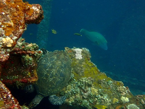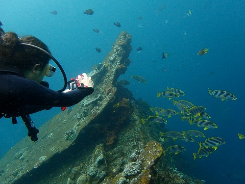 波なし、流れ時々、水温28℃、浅いところはお味噌汁状態ですが、沈船の透明度は12mほど。どんどん透明度は上がっていきました。