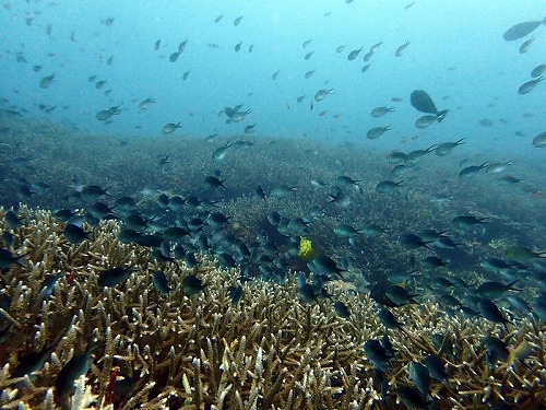 波少し、うねりあり、透明度10m(根は真っ白)、水温29℃