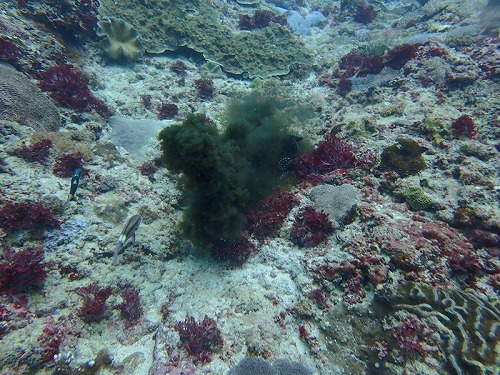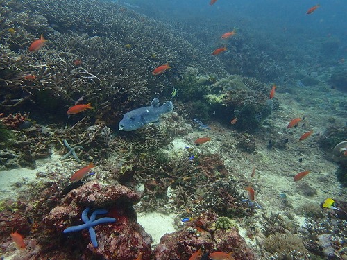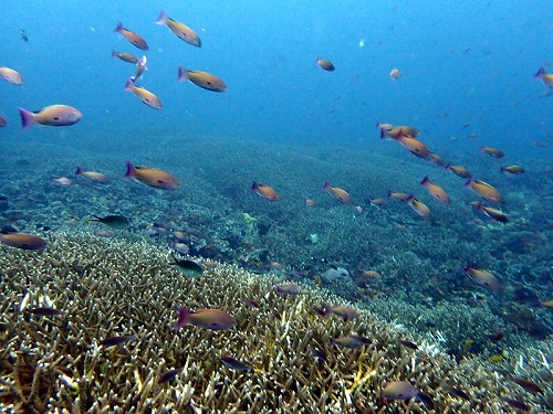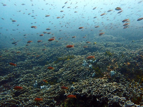 ゆるーい流れ、透明度18m、水温28℃、ダイバーも多し