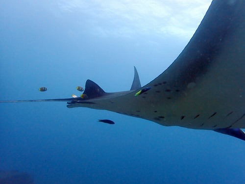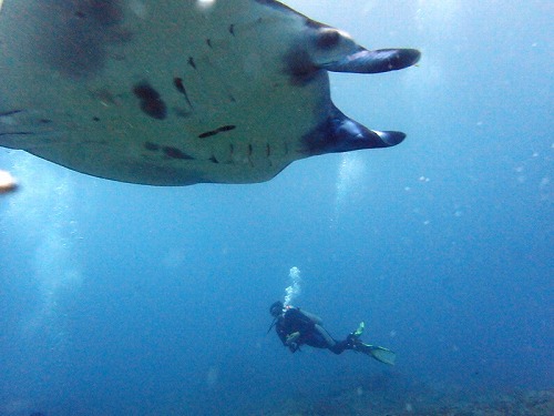 船酔い気味でしたが、頑張ってゆっくりエントリーすると、水中ではしゃきっと戻りました!マンタの邪魔をしていけず、サンゴを傷つけてはならず、ダイバーもうじゃうじゃ。中性浮力必須。ウェイトもばっちり。