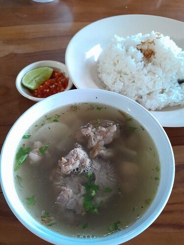 なんと隣のワルンが夜まで営業と聞き、二人でSoto Babi(豚スープ)で腹ごしらえ。