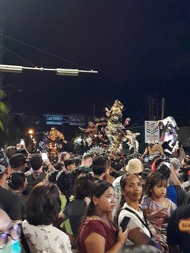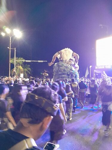 今年は背の高い大きなオゴオゴ(張りぼて人形)がないな・・と思っていたのですが、わかりました。現在問題の電線ですね!電線数が半端なく無造作に張り巡っているので、練り歩くにもオゴオゴがくぐれないので小型化したのでしょう。実際電線が切れちゃったところもありました。